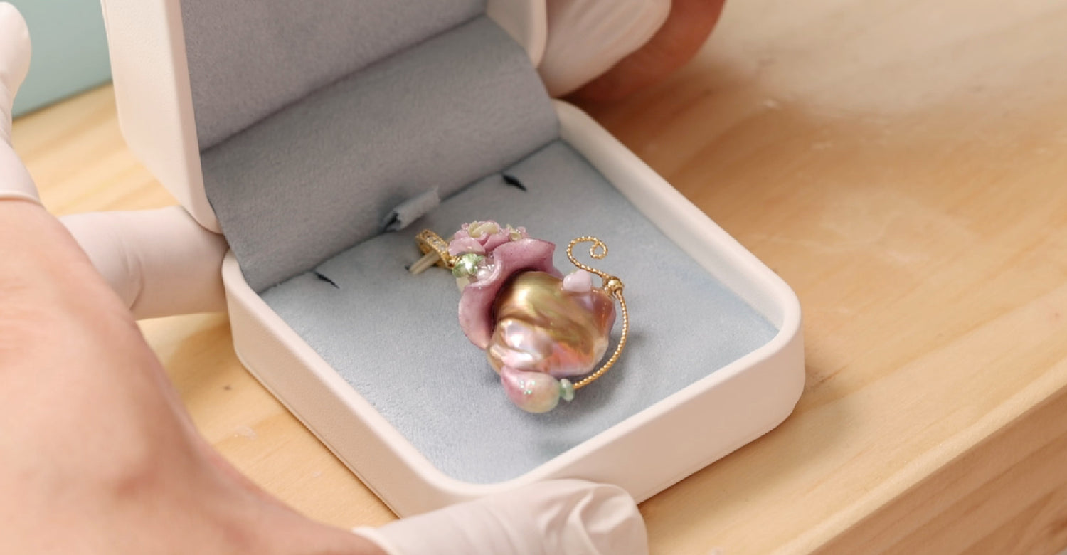 Pearlolo is handcrafted jewelry made with natural pearls and thoughtfully chosen metal details. Each pearl is hand-set, and our tiny hats and floral accents are sculpted by hand from UV-cured resin—then finished piece by piece. No molds, no mass production—just small-batch creations with real character.