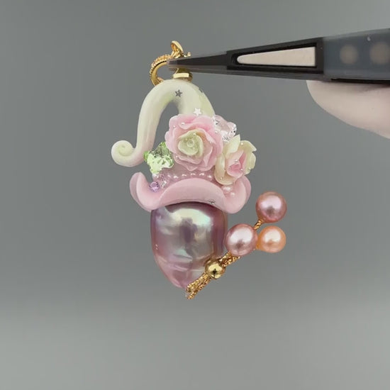 Materials: Natural freshwater pearl (mostly baroque) + gold-/silver-plated copper + hand-sculpted, hand-painted UV-cured resin hat (nail-art gel) + clear protective sealing layer