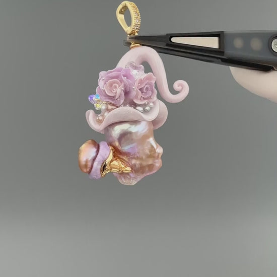 Materials: Natural freshwater pearl (mostly baroque) + gold-/silver-plated copper + hand-sculpted, hand-painted UV-cured resin hat (nail-art gel) + clear protective sealing layer